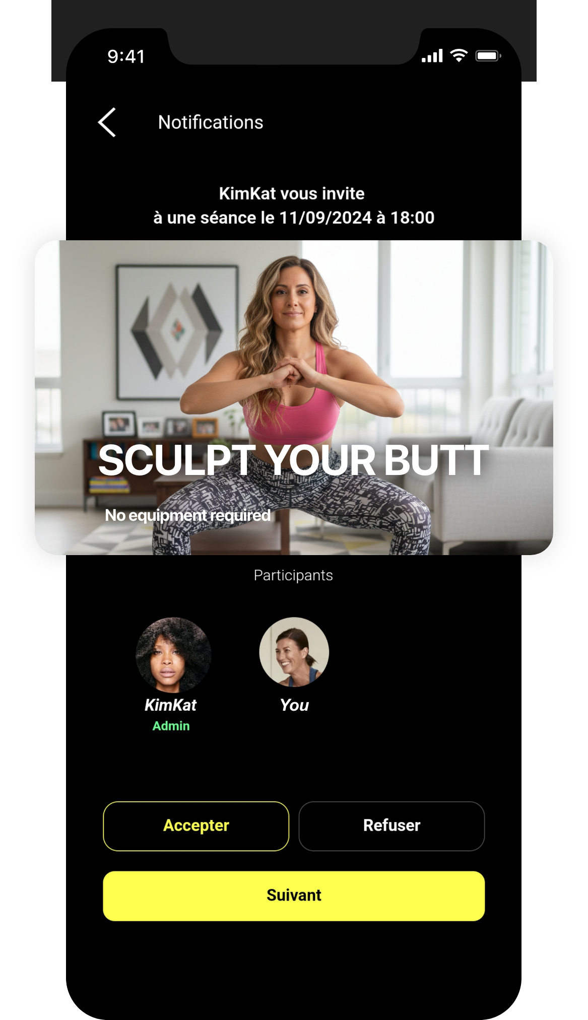 Dès que vos invités acceptent l'invitation, ils reçoivent une notification immédiate. Vous intégrez alors le même salon virtuel pour participer à la séance de fitness en temps réel. C'est simple, rapide et terriblement motivant !